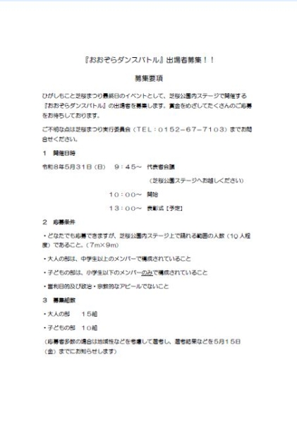 第42回ひがしもこと芝桜まつりのイベントとして、「おおぞらダンスバトル」を開催します!詳しくは要項をご覧ください。たくさんのご参加をお待ちしております!